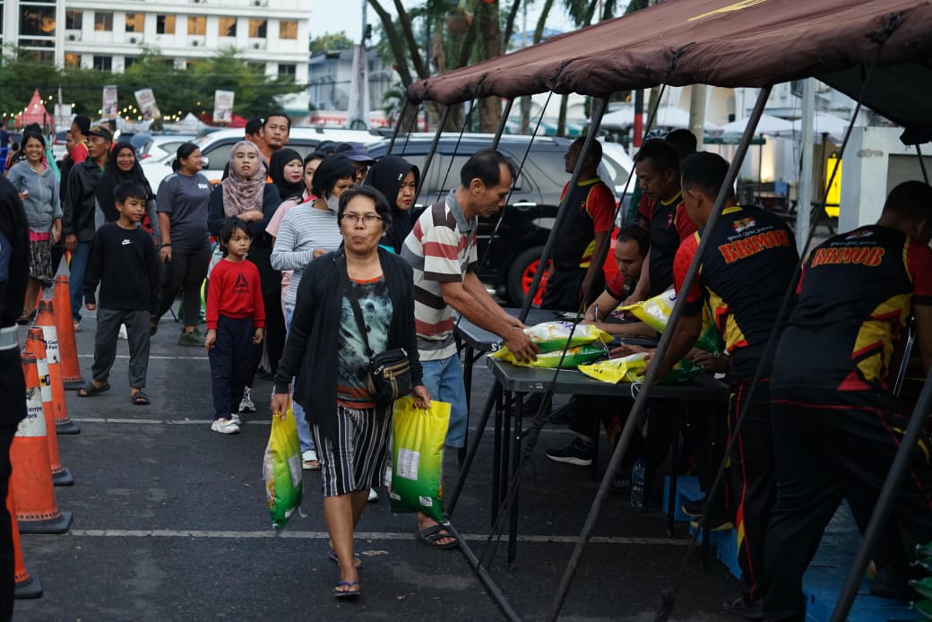 Sejak pukul 06.00 WIB, masyarakat sudah memadati area depan Bank BCA Lapangan Merdeka. Personel Brimob hadir dengan semangat memberikan pelayanan terbaik, mulai dari menyediakan beras berkualitas dengan harga terjangkau sebanyak 800 sak, hingga mengajak masyarakat mengibarkan semangat merah putih melalui pembagian bendera secara gratis.