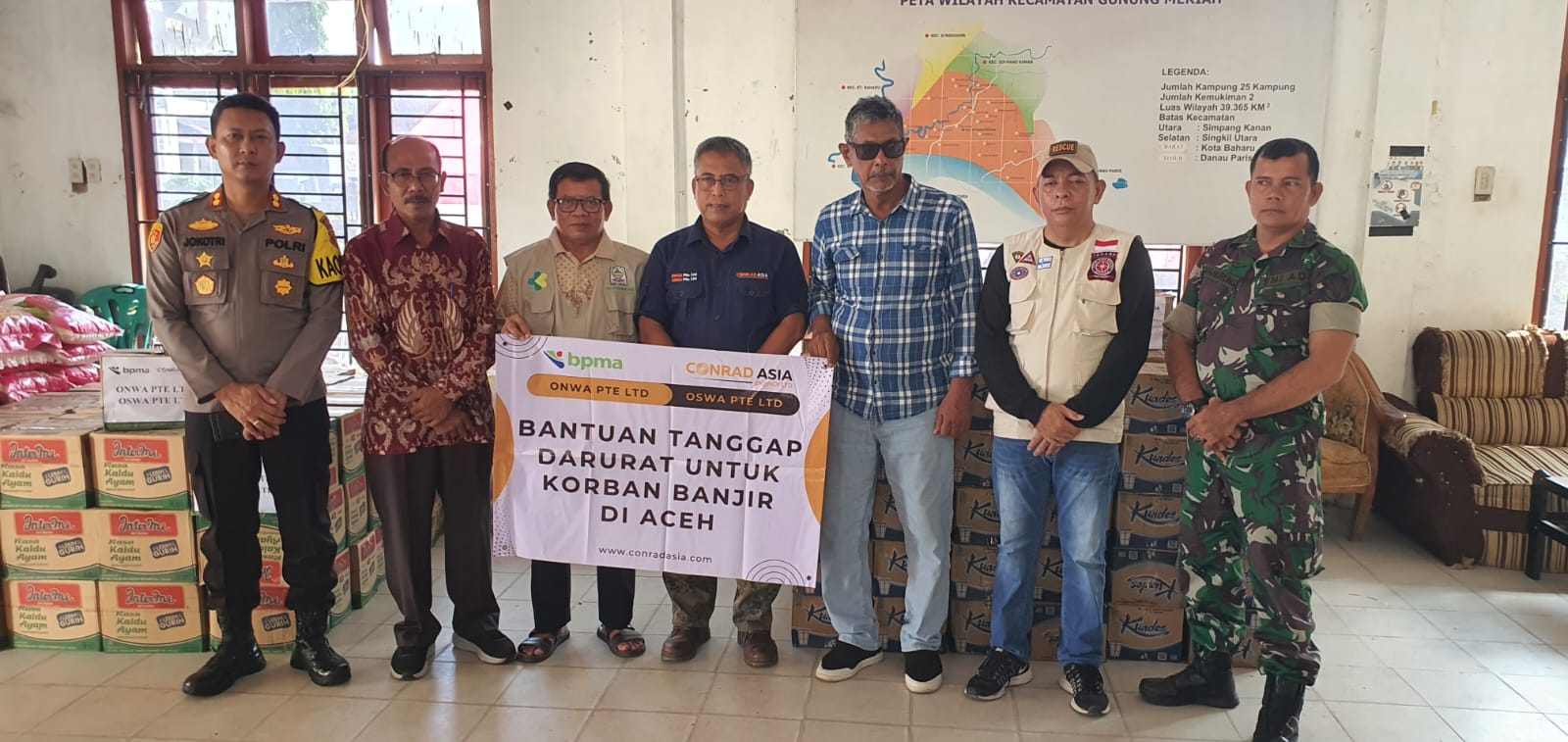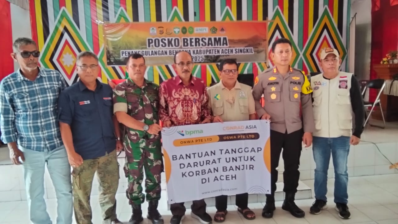 Aceh Singkil.CN Conrad Asia Energy melalui dua anak perusahaannya yang beroperasi di Aceh, ONWA Pte Ltd dan OSWA Pte Ltd, menyalurkan paket bantuan bagi masyarakat terdampak banjir dan longsor di kabupaten Aceh Singkil