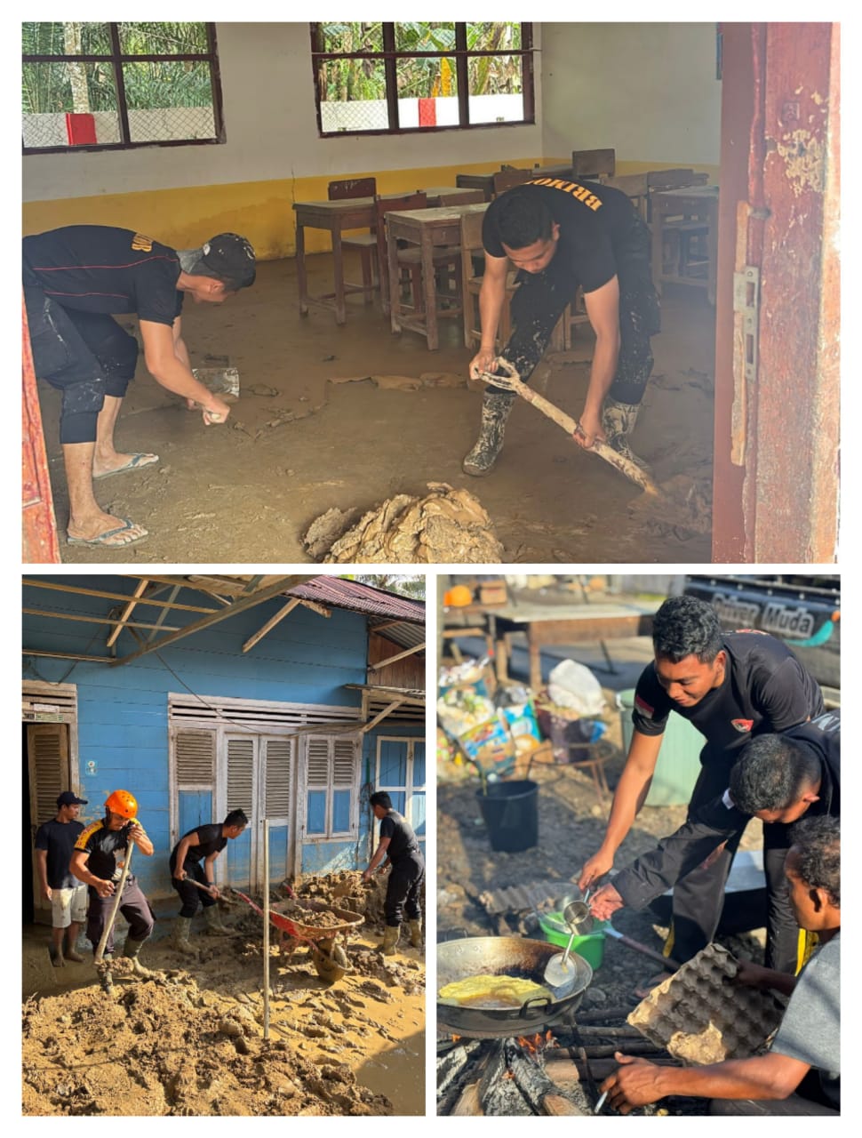 Sejak pagi pasukan Brimob bergerak cepat ke lokasi-lokasi paling parah terdampak banjir bandang dan longsor. Dengan peralatan seadanya di tengah medan sulit, personel tetap berupaya maksimal, mulai dari pembersihan rumah warga, rumah ibadah, hingga membuka dapur lapangan untuk memastikan kebutuhan konsumsi masyarakat tercukupi.