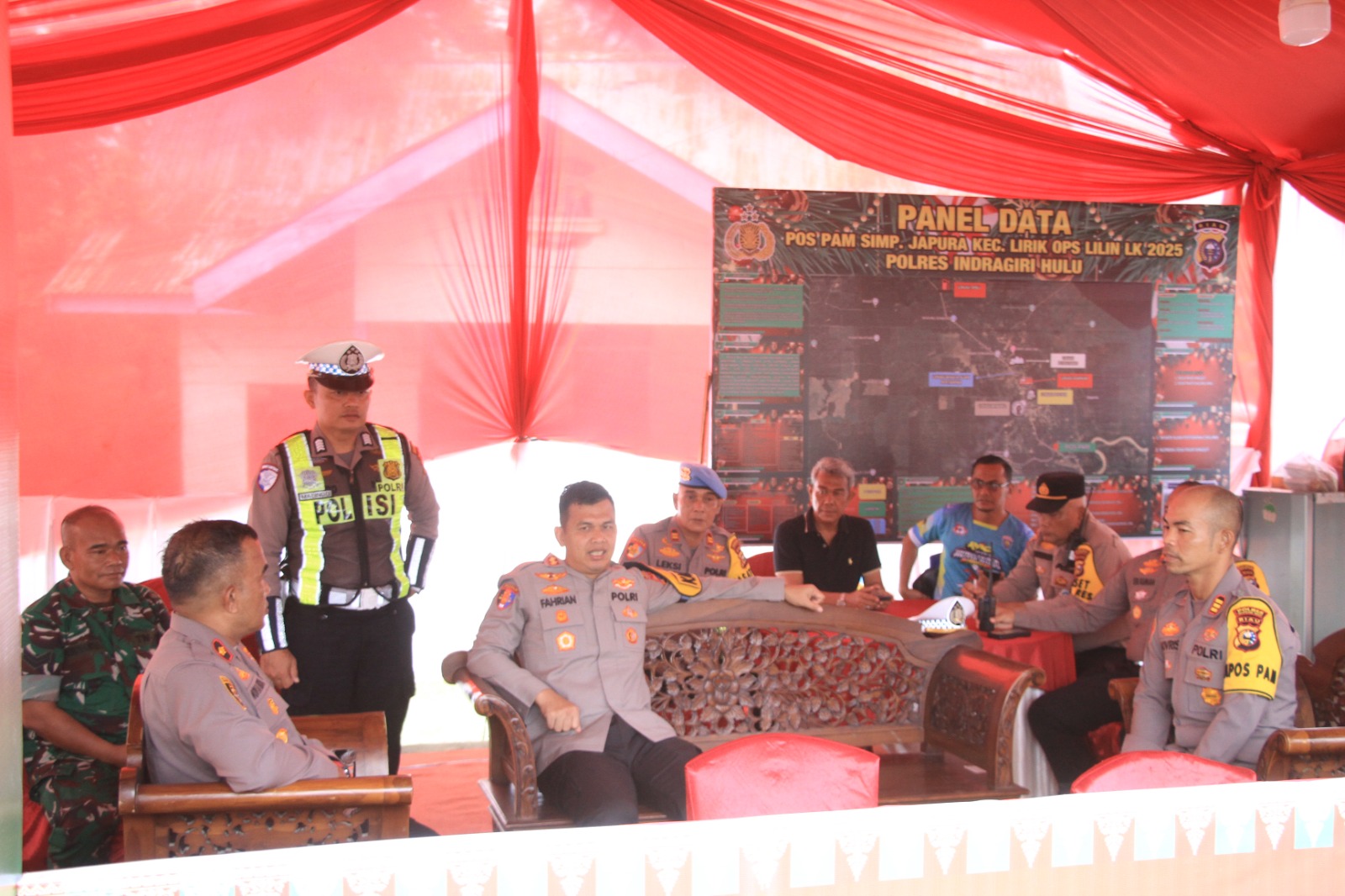 Kapolres Inhu bersama Tim 1 meninjau Pos PAM Simpang Japura KM 179 Kecamatan Lirik. Dalam kunjungannya, Kapolres memastikan kesiapan personel lintas instansi yang terdiri dari Polri, TNI, Dishub, Satpol PP, BPBD, Dinas Kesehatan hingga Senkom, baik dari sisi kekuatan personel, sarana prasarana, maupun kesiapan pelayanan kepada masyarakat.