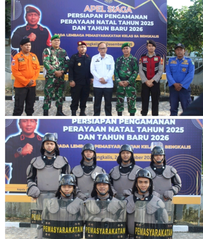 Bengkalis – Dalam rangka memastikan keamanan dan ketertiban selama perayaan Natal Tahun 2025 dan Tahun Baru 2026, Lembaga Pemasyarakatan (Lapas) Kelas IIA Bengkalis menggelar Apel Siaga Pengamanan yang diikuti seluruh pegawai Lapas Bengkalis, bertempat di lapangan Lapas Kelas IIA Bengkalis(24/12). Apel ini dipimpin oleh Kepala Bidang Pembimbing Kemasyarakatan Kantor Wilayah Direktorat Jenderal Pemasyarakatan Riau,Yusup Gunawan, serta turut dihadiri unsur Polres Bengkalis, Kodim 0303 Bengkalis, BPBD, dan Dinas Pemadam Kebakaran Kabupaten Bengkalis.