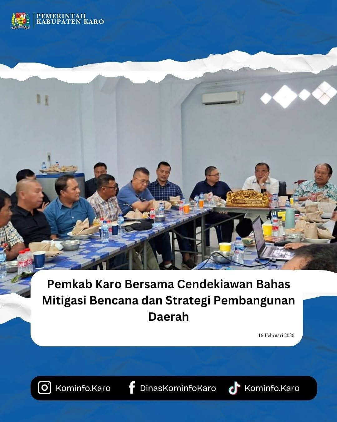 Kabanjahe CN.Id. 16 Februari 2026 – Pemerintah Kabupaten Karo menggelar diskusi bersama Cendekiawan Karo Indonesia dan Tim Percepatan Pembangunan Daerah (TP2D) guna membahas mitigasi bencana longsor, banjir, gempa bumi, serta arah kebijakan pembangunan daerah dalam mendukung visi dan misi kepala daerah.