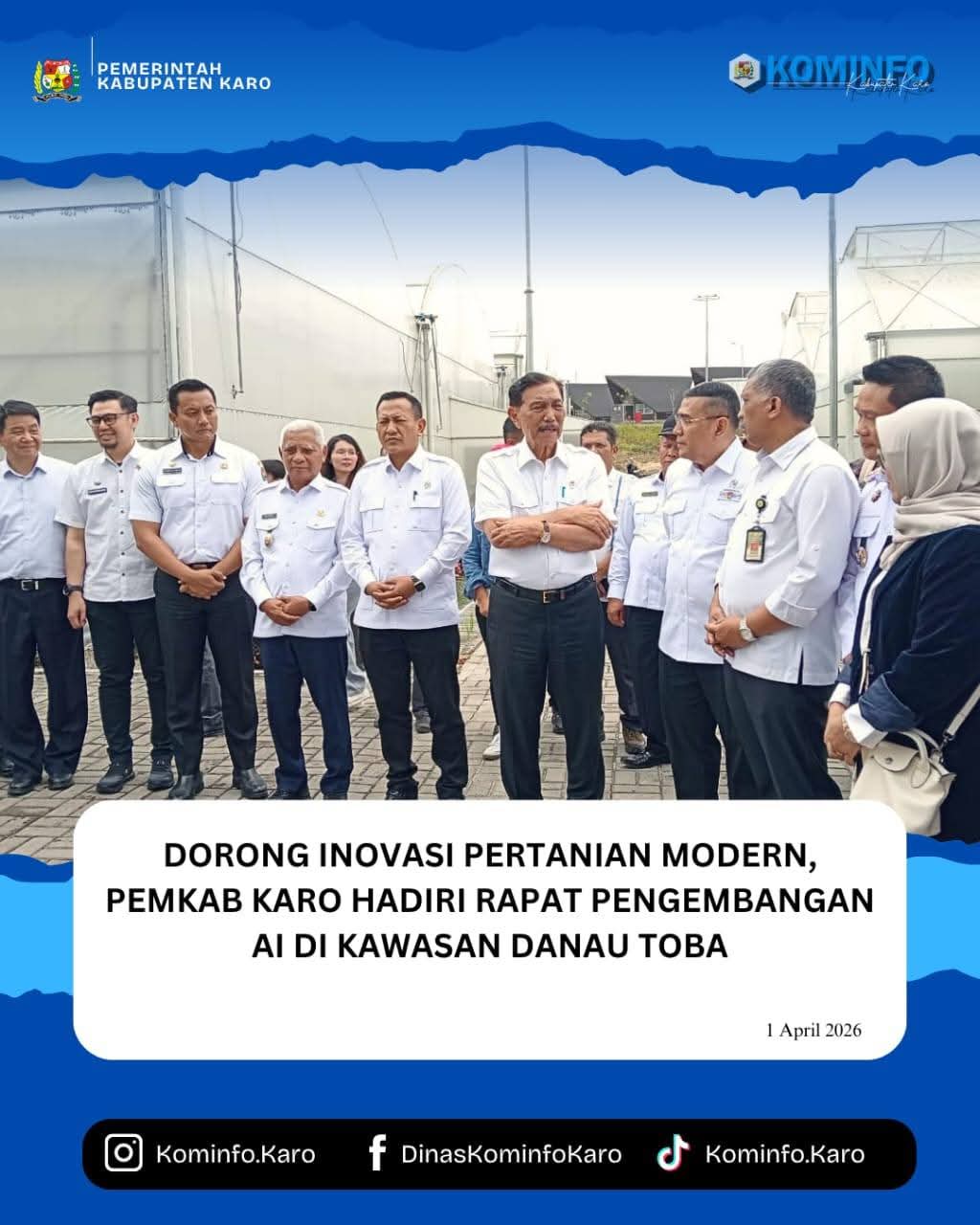 Humbang Hasundutan CN.Id.  Bupati Karo, Brigjen Pol (Purn) Dr. dr. Antonius Ginting, Sp.OG., M.Kes., diwakili oleh Sekretaris Daerah Kab.Karo Gelora Kurnia Putra Ginting, S.STP., M.M., menghadiri Rapat Pembahasan Pengembangan Pertanian Berbasis Artificial Intelligence (AI) di Kawasan Danau Toba, yang diselenggarakan oleh Dewan Ekonomi Nasional di Kawasan Taman Sains Teknologi Herbal dan Hortikultura (TSTH2) Aek Nauli, Kecamatan Pollung, Kabupaten Humbang Hasundutan, Sumatera Utara, pada Rabu (1/4/2026).