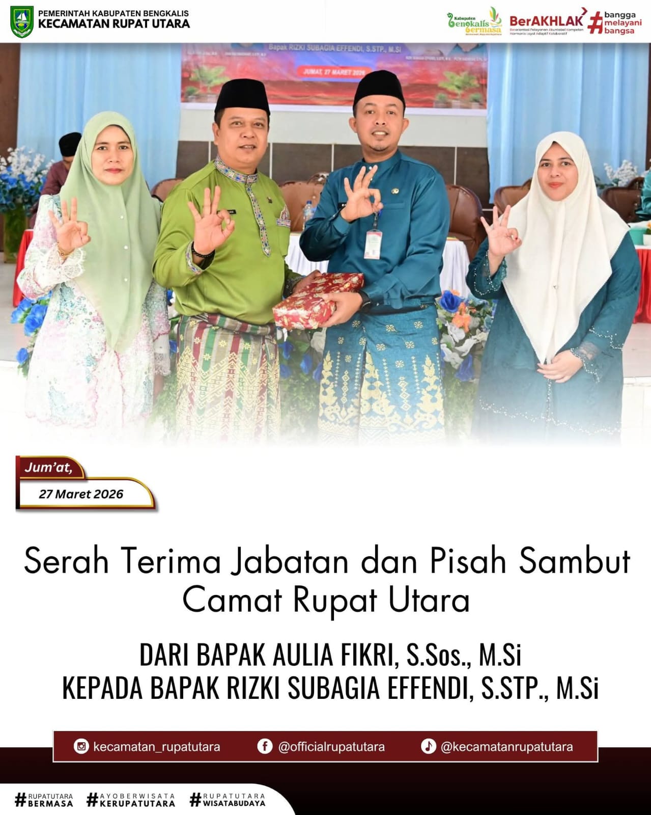 TANJUNG MEDANG CN Kecamatan Rupat Utara melaksanakan acara Serah Terima Jabatan (Sertijab) dan pisah sambut Camat Rupat Utara dari Bapak Aulia Fikri, S.Sos., M.Si. kepada Bapak Rizki Subagia Effendi, S.STP., M.Si., pada Jumat (27/03/2026).
