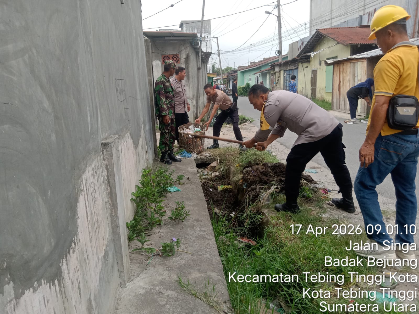 Tebing Tinggi-(Sumut).CN- Personel Polsek Rambutan Polres Tebing Tinggi bersama forkopimcam Rambutan dan masyarakat melaksanakan kegiatan gotong royong bersih lingkungan di Kampung Semut Jalan Badak Lingkungan 07 Kelurahan Badak Bejuang Kota Tebing Tinggi, Jumat (17/4/2026).