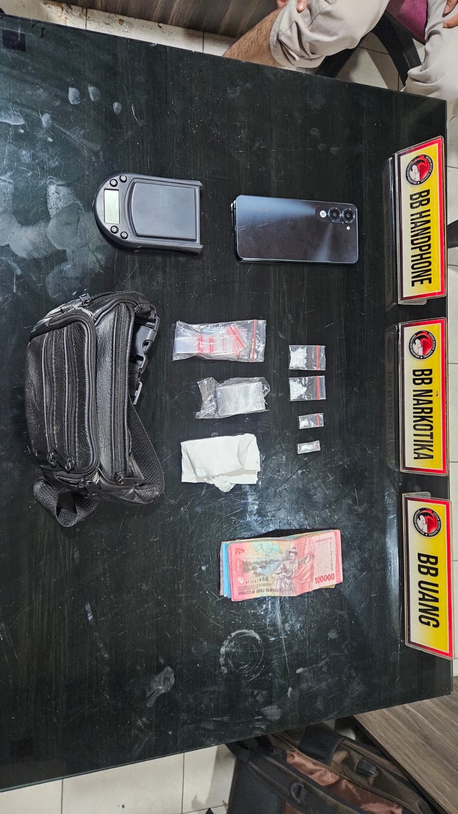 Selain itu, turut diamankan satu buah tas hitam bertuliskan SEA-ZONN, satu unit timbangan digital, uang tunai sebesar Rp500.000,- serta satu unit handphone merk Vivo warna hitam yang diduga digunakan untuk transaksi.