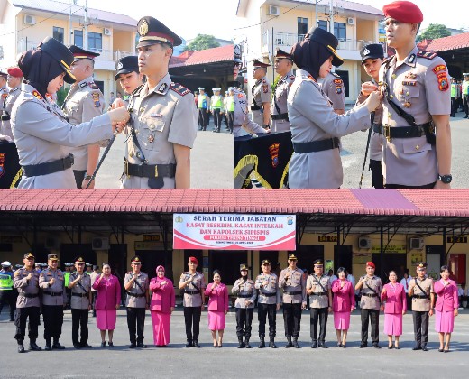 Tebing Tinggi-(Sumut).CN- Kapolres Tebing Tinggi, AKBP Rina Frillya, S.I.K., memimpin langsung upacara Serah Terima Jabatan (Sertijab) Kasat Reskrim, Kasat Intelkam dan Kapolsek Sipispis yang dilaksanakan di Lapangan Apel Polres Tebing Tinggi, Senin pagi (20/4/2026).