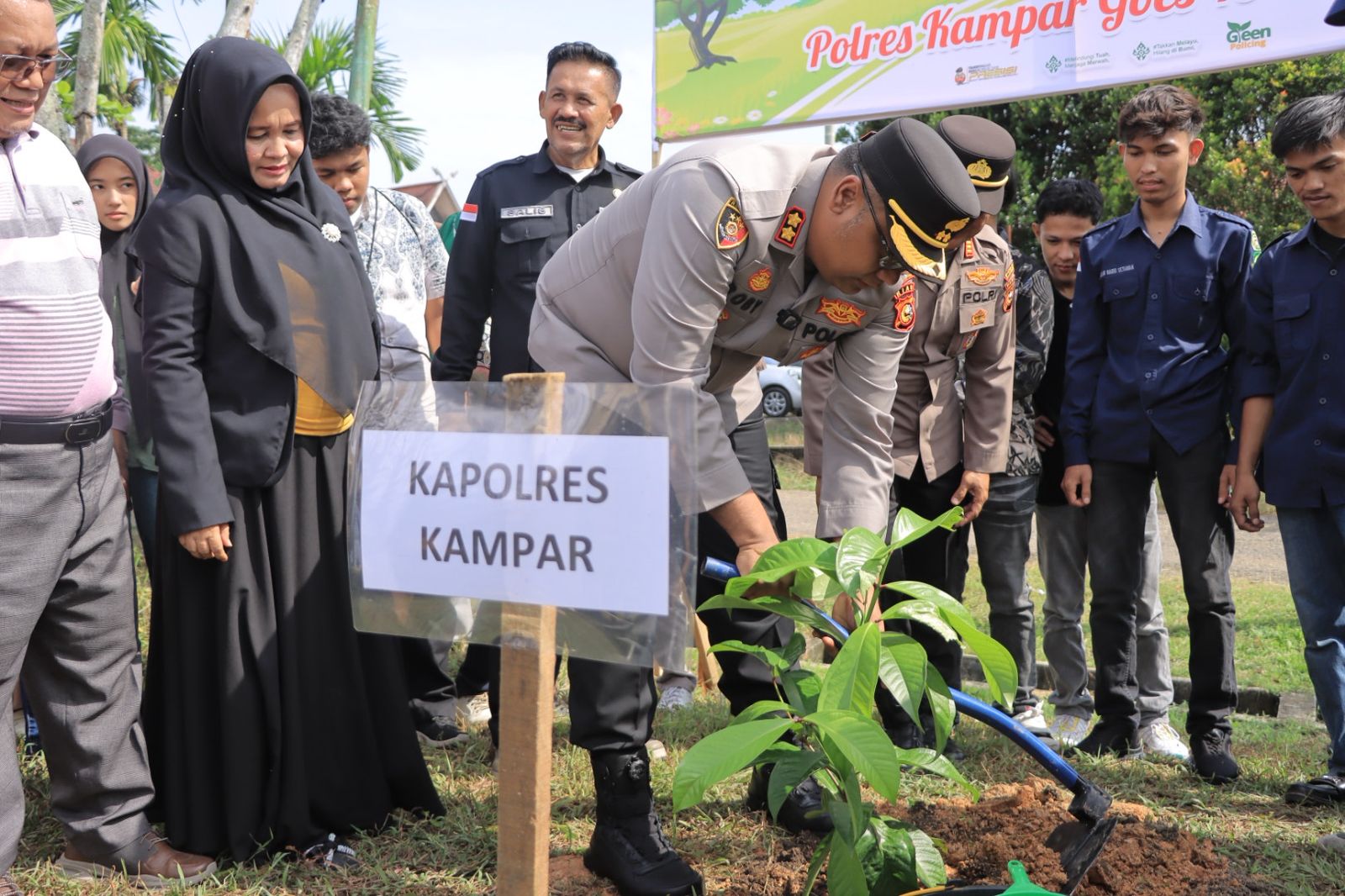 Bangkinang,-CN -Kapolres Kampar AKBP Boby Putra Ramadhan Sebayang, memimpin kegiatan sosialisasi Green Policing dengan tema “Polres Kampar Goes To Campus” pada hari Selasa (21/04/2026) pukul 09.00 WIB di Kampus Sekolah Tinggi Ilmu Ekonomi (STIE) Bangkinang, Jalan A. Rahman Saleh Kecamatan Bangkinang Kota. Kegiatan yang bertujuan untuk meningkatkan kesadaran mahasiswa tentang pelestarian lingkungan dan pencegahan Karhutla juga diisi dengan penanaman bibit pohon secara simbolis.