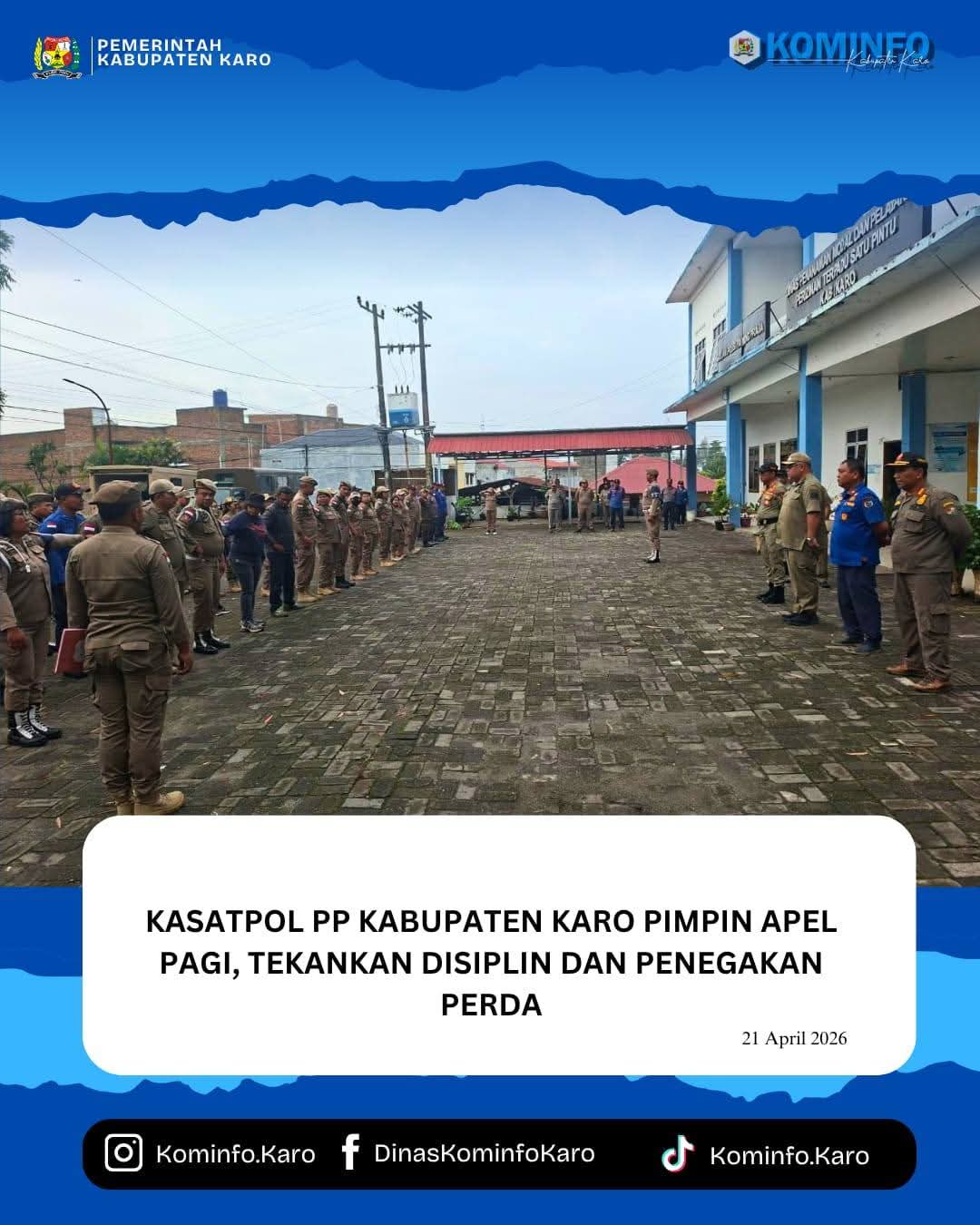 Tanah Karo,CN.Id. Selasa, 21 April 2026 — Dalam rangka mendukung pelaksanaan tugas dan fungsi serta mewujudkan visi dan misi Bupati Karo, Brigjen Pol (Purn.) Dr. dr. Antonius Ginting, Sp.OG, M.Kes., Satuan Polisi Pamong Praja Kabupaten Karo melaksanakan kegiatan apel pagi yang dipimpin langsung oleh Kepala Satuan Polisi Pamong Praja Kabupaten Karo, Jon Karnanta Sembiring, S.T., M.Si.