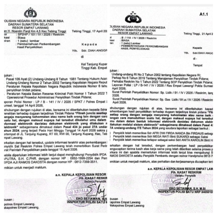 Berdasarkan SP2HP yang diterbitkan, Sat Reskrim Polres Empat Lawang juga telah mengeluarkan Surat Perintah Tugas dan Surat Perintah Penyelidikan guna mendalami perkara ini lebih lanjut.