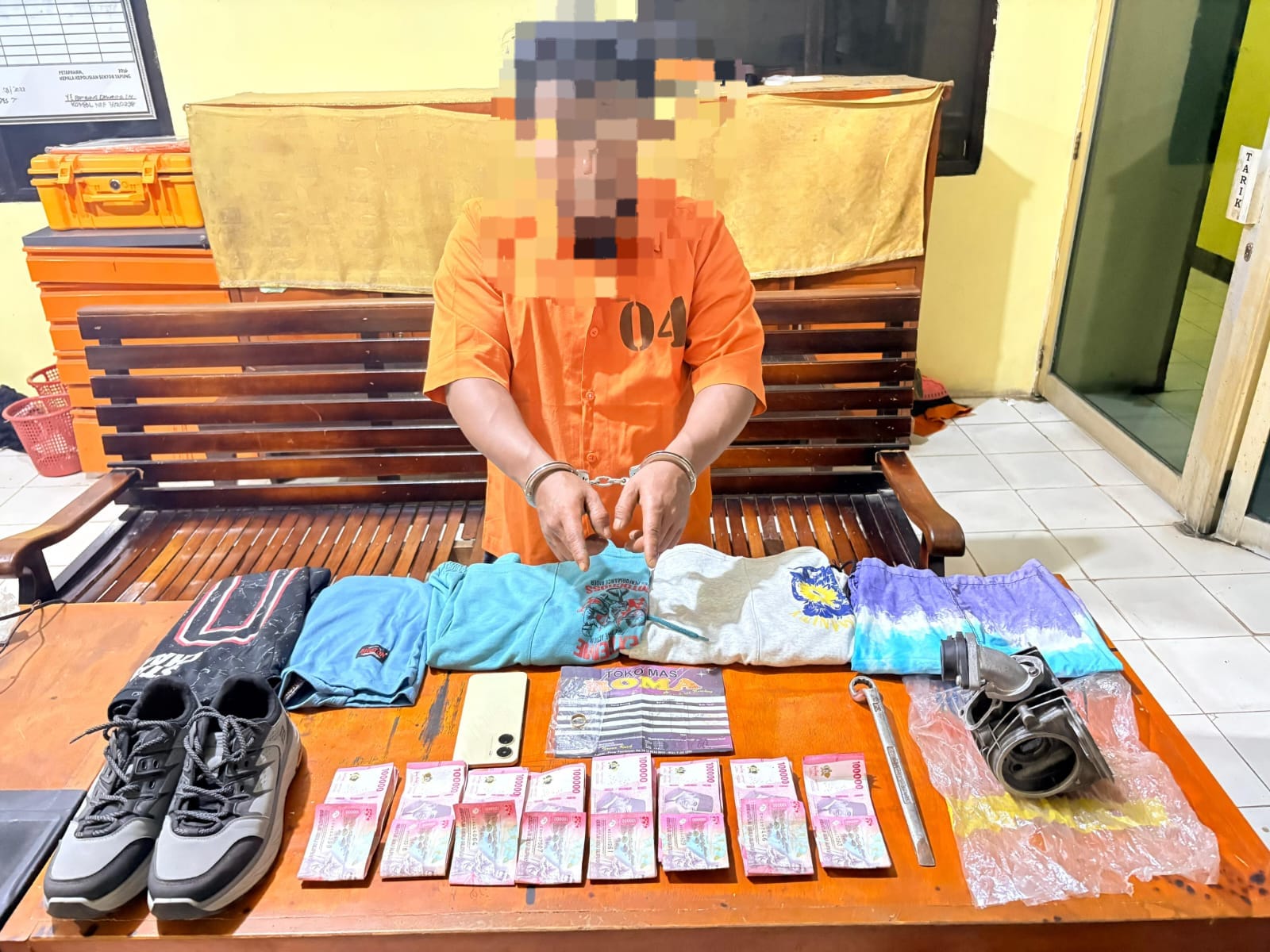 Dari penangkapan pelaku berhasil kita amankan uang tunai Rp 8,2 Juta, celana pendek warna ungu campur biru, cincin emas 21 karat seberat 2 gram, selembar kwitansi pembelian cincin emas 21 karat, HP dan barang bukti lainnya.