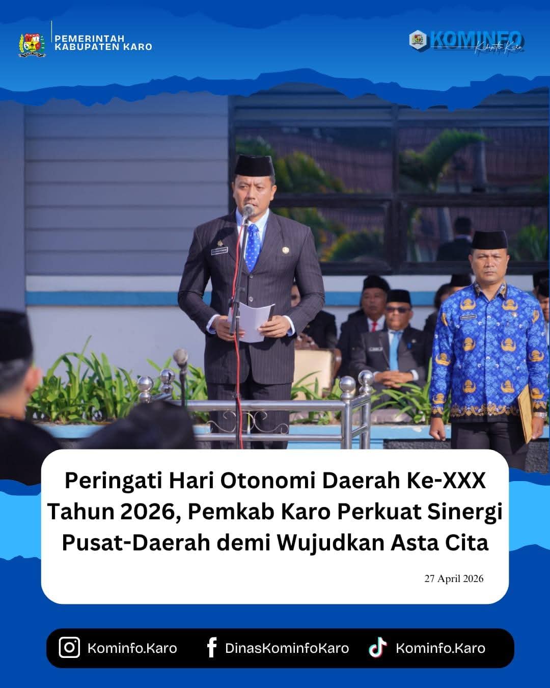 KABANJAHE CN.Id. Pemerintah Kabupaten Karo menggelar Upacara Peringatan Hari Otonomi Daerah (Otda) ke-XXX Tahun 2026 di halaman Kantor Bupati Karo. Mewakili Bupati Karo Brigjen Pol (Purn) Dr. dr. Antonius Ginting, Sp.OG., M.Kes., Sekretaris Daerah Kabupaten Karo Gelora Kurnia Putra Ginting, S.STP., M.M. bertindak sebagai pimpinan upacara.