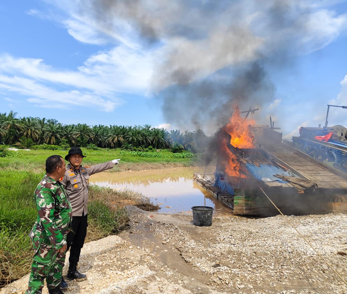 Tanpa menunggu lama, sekitar pukul 13.00 WIB, tim gabungan bersama pengurus koperasi menuju lokasi dan menemukan sebanyak 12 unit rakit PETI dalam kondisi tidak beroperasi. Meski para pelaku tidak berada di lokasi, aparat langsung melakukan tindakan tegas berupa pemusnahan seluruh rakit dengan cara dibakar guna mencegah kembali digunakan untuk aktivitas ilegal.