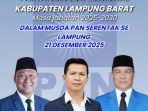 Lampung Barat CN – Musyawarah Daerah ( Musda ) VI Partai Amanat Nasional resmi di gelar pada Minggu 21 Desember 2025 Musda